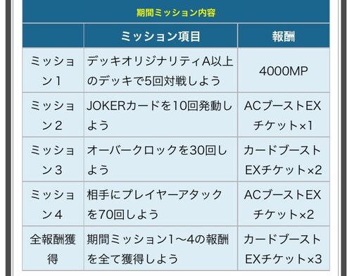 いつものミッションの話です今回はこちら1、デッキオリジナリティA以上で5戦…やって下さい2、ジョーカー10回発動…ジョーカーゲージ増加系のカードを入れ、ゲージ消費小ジョーカーを選ぶと捗る。店内対戦でお互いのジョーカーゲージ増やすインセプ使う…